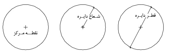 1- نقطه مرکز (Center Point)، 2-شعاع (Radius)، 3- قطر (Diameter)