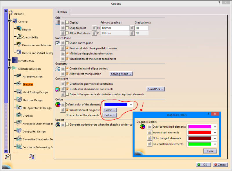 المان ها و قیود در محیط Sketcher نرم افزار Catia می توانند رنگ های مختلفی داشته باشند.
